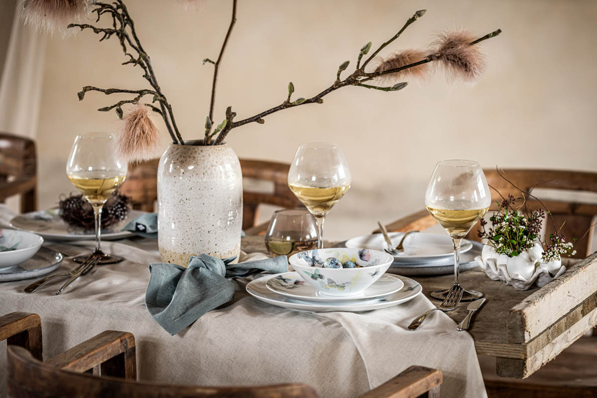 Zupełnie odmienny styl zapewni kamionkowa zastawa WAVE, inspirowana odcieniami morza i wyrażająca tęsknotę za słońcem. Z jej użyciem stworzymy wyjątkową, rustykalną aranżację, wypełnioną naturalnymi akcentami i spokojną paletą barw – szarościami i beżami. Ręcznie wykonane i szkliwione elementy kolekcji WAVE wyróżniają się niepowtarzalnym charakterem, a razem tworzą niezwykłą, harmonijną całość. Drewniany stół, lniane tkaniny w swobodnych formach, naturalnie zdobione jajka, ozdobione piórkami bazie i wierzbowe gałązki dopełnią całości.
