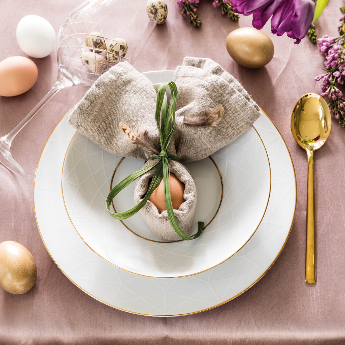 Stół wielkanocny mieniący się złotymi i diamentowymi detalami? Do takiej aranżacji najlepszym wyborem będzie porcelana DIAMOND, utrzymana w kolorze perły i srebrzystej bieli, na tle których niezwykły efekt tworzy wzór inspirowany diamentowymi szlifami. Wrażenie luksusu potęgują ręcznie malowane zdobienia z 18-karatowego złota. Wspaniałą kompozycję stworzymy stawiając te naczynia na naturalnym obrusie, w kolorze zgaszonego różu. Do tego złote sztućce i nieodzowne bukiety żółtych żonkili oraz fioletowych tulipanów.