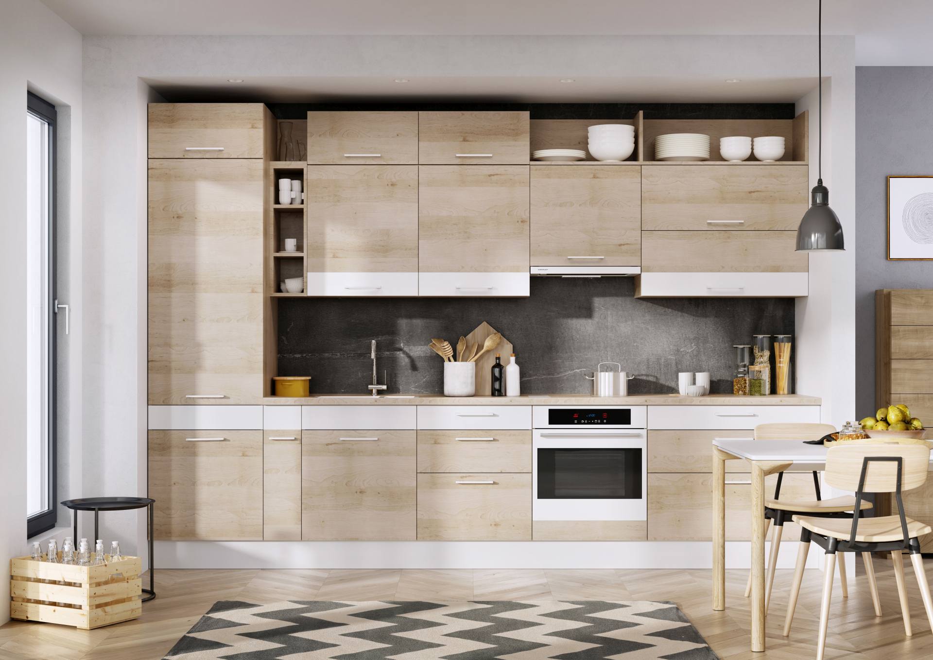 Urządzenie małej kuchni jest nie lada wyzwaniem. Wymaga dobrze przemyślanych decyzji i praktycznych rozwiązań, które pozwolą optymalnie ją zabudować i wyposażyć. Pomysły na aranżację muszą iść w parze z rozsądnym zagospodarowaniem przestrzeni, jaką dysponujemy. Kiedy liczy się każdy centymetr, trzeba efektywnie go spożytkować. Gdzie szukać dodatkowego miejsca, którego tak bardzo brakuje we wnętrzach o niewielkim metrażu ? Najpierw pod sufitem. To całkiem spory zapas powierzchni do przechowywania. Dzięki szafkom do wysokości sufitu nie marnujemy miejsca, ponieważ zabudowując ścianę nie tylko w szerz, ale i na wysokość, wykorzystujemy cały dostępny potencjał. Dodatkowy bonus takiego rozwiązania? Zabudowa do wysokości sufitu nie tylko więcej pomieści, ale prezentuje się atrakcyjnie wizualnie.